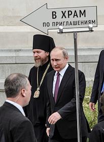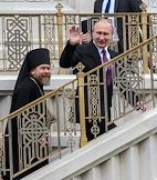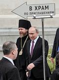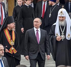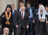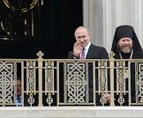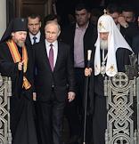 Торжественная церемония освящения нового храма Воскресения Христова и Новомучеников и Исповедников Церкви Русской московского Сретенского монастыря. Слева направо: архимандрит, наместник московского Сретенского ставропигиального мужского монастыря, ответственный секретарь Патриаршего совета по культуре Тихон Шевкунов, президент России Владимир Путин и Патриарх Московский и Всея Руси Кирилл во время церемонии.