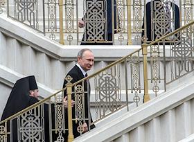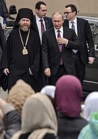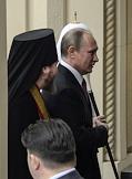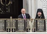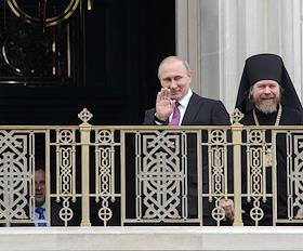 Торжественная церемония освящения нового храма Воскресения Христова и Новомучеников и Исповедников Церкви Русской московского Сретенского монастыря. Президент России Владимир Путин (слева) и архимандрит, наместник московского Сретенского ставропигиального мужского монастыря, ответственный секретарь Патриаршего совета по культуре Тихон Шевкунов (справа) во время церемонии.