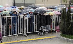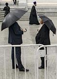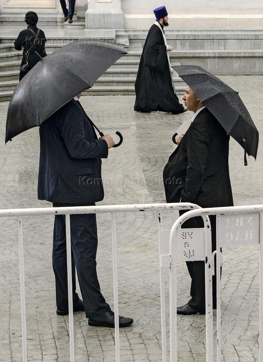 Торжественная церемония освящения нового храма Воскресения Христова и Новомучеников и Исповедников Церкви Русской московского Сретенского монастыря. Жанровая фотография. Мужчины в костюмах под зонтами.