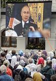 Торжественная церемония освящения нового храма Воскресения Христова и Новомучеников и Исповедников Церкви Русской московского Сретенского монастыря. Верующие во время церемонии. Президент России Владимир Путин (на экране) во время церемонии.