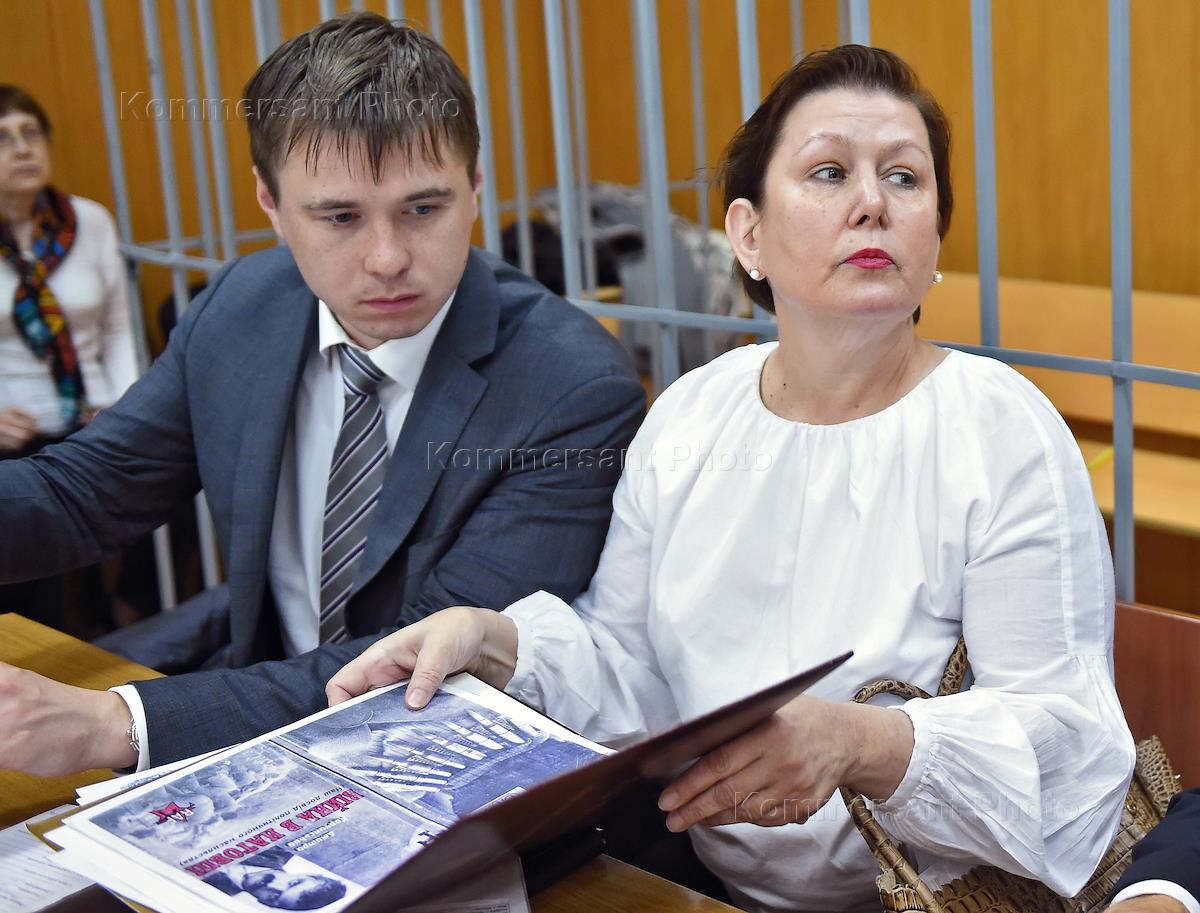 Бывший директор Библиотеки украинской литературы Наталья Шарина (слева), обвиняемая в экстремизме и растрате, и адвокат Иван Павлов (справа) во время заседания в Мещанском суде.