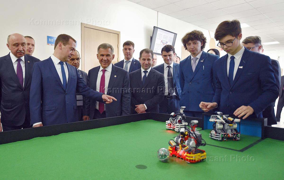 Рабочая поездка председателя правительства России Дмитрия Медведева в Казань. Слева направо: ректор Казанского (Приволжского) федерального университета Ильшат Гафуров, председатель правительства Росси Дмитрий Медведев, президент Республики Татарстан Рустам Минниханов и представитель президента России в Приволжском федеральном округе Михаил Бабич во время посещения класса робототехники в IT-лицее Казанского (Приволжского) федерального университета.