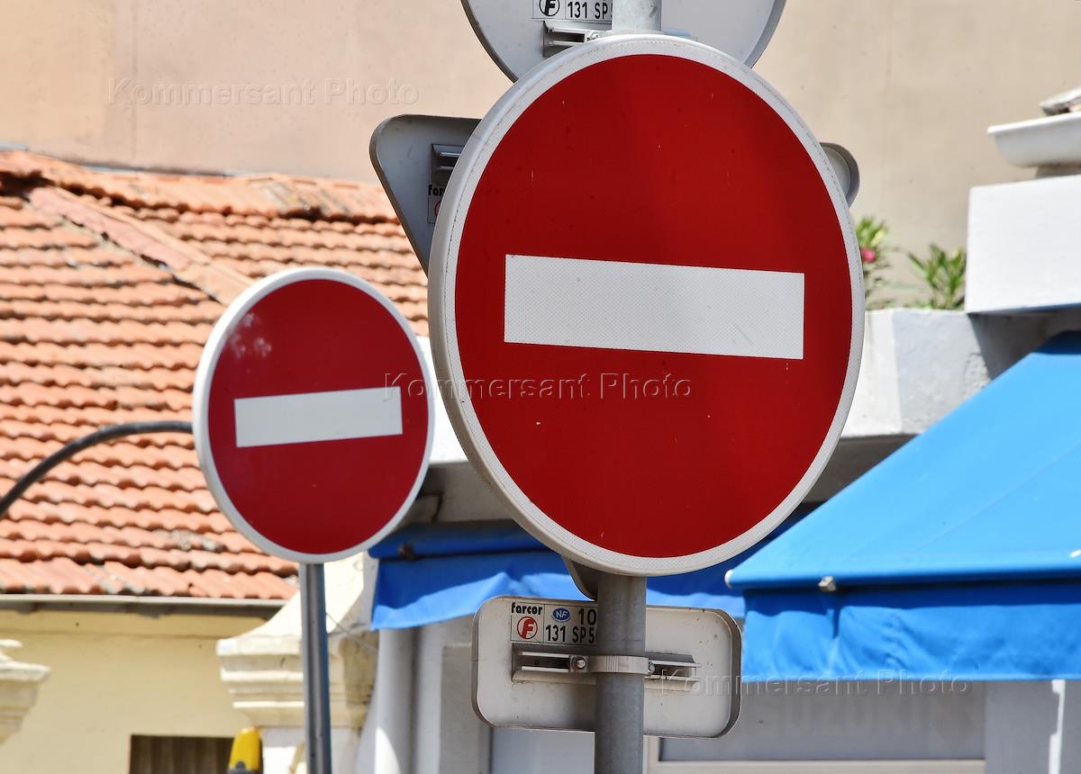 Виды Канн. Жанровая фотография. Дорожные знаки "Въезд запрещен" ("кирпич") на улице города.