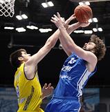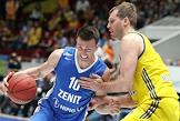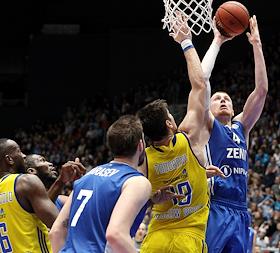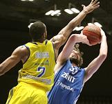 Единая лига ВТБ, полуфинал. Матч между командами "Зенит" и "Химки". Игрок команды "Зенит" Стефан Маркович (справа) и игрок команды "Химки" Алексей Швед (слева) во время матча.