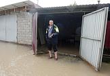 Последствия наводнения. Жительница по колено в воде перемещается по затопленной улице.