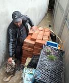 Последствия наводнения. Мужчина возле жилого дома тянет по воде доски, сбитые в плот для эвакуации утвари.