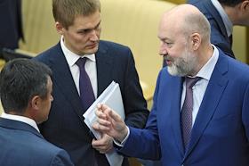 Пленарное заседание Государственной думы (ГД) России. Председатель комитета ГД по труду, социальной политике и делам ветеранов Ярослав Нилов (слева) и член комитета ГД России по экономической политике, промышленности, инновационному развитию и предпринимательству Владимир Сысоев (справа) во время заседания.