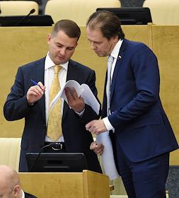 Пленарное заседание Государственной думы (ГД) России. Член Комитета ГД России по информационной политике, информационным технологиям и связи Евгений Ревенко (слева) и член комитета ГД России по труду, социальной политике и делам ветеранов Андрей Исаев (справа) во время заседания.