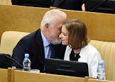 Пленарное заседание Государственной думы (ГД) России. Председатель комитета ГД России по государственному строительству и законодательству Павел Крашенинников (слева) и член комитета ГД России по государственному строительству и законодательству Ольга Баталина (справа) во время заседания.