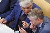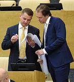 Пленарное заседание Государственной думы (ГД) России. Председатель комиссии ГД России по вопросам депутатской этики Отари Аршба (слева) и член комитета ГД России по информационной политике, информационным технологиям и связи Евгений Ревенко (справа) во время заседания.