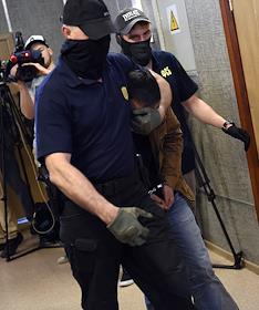 Обвиняемый в подготовке терактов в Москве Фуркат Кушаев (в центре) перед началом заседания Мещанского районного суда.