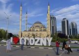 Виды города Грозный. Люди на площади пере мечетью "Сердце Чечни" имени Ахмата Кадырова.