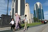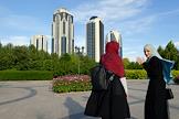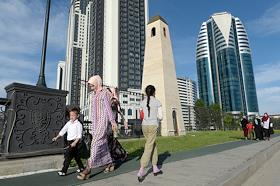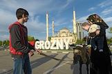 Виды города Грозный. Семья на площади перед мечетью "Сердце Чечни" имени Ахмата Кадырова.