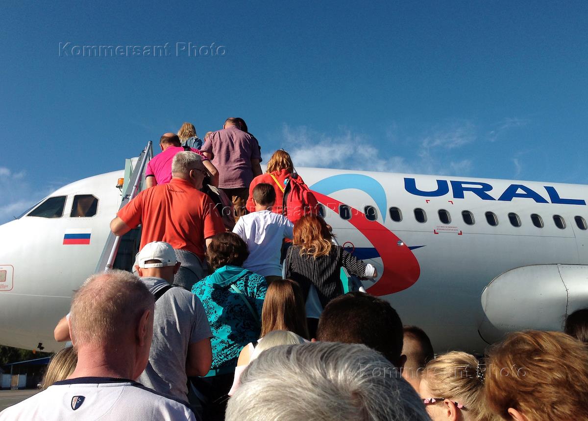 Жанровая фотография. Пассажиры авиакомпании "Уральские авиалинии" перед посадкой в самолет.