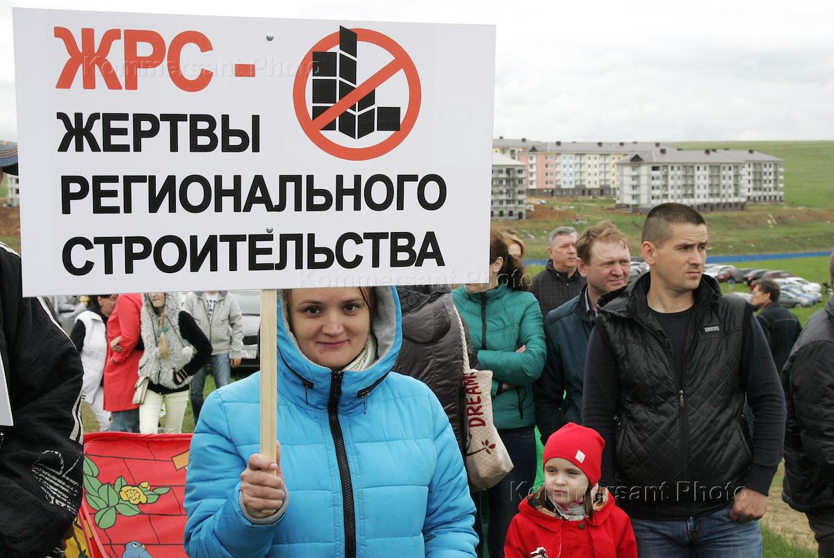 Митинг обманутых дольщиков ЖК "Smart City" прошел в поселке Новинки. Участники митинга с плакатом "ЖРС - жертвы регионального строительства".