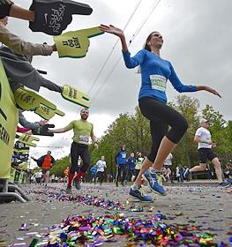 Первый благотворительный Зеленый марафон "Бегущие сердца", организованный Фондом помощи детям "Обнаженные сердца" совместно со Сбербанком России, прошел на Воробьевых горах. Основатель Фонда "Обнаженные сердца" Наталья Водянова во время марафона.