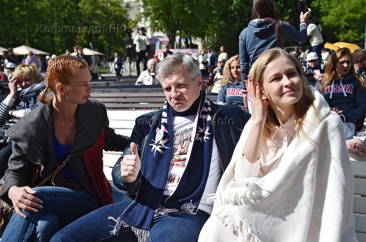 XVII открытый фестиваль искусств "Черешневый лес". Церемония вручения премии Олега Янковского "Творческое открытие" прошла на территории олимпийского комплекса "Лужники". Слева направо: актриса Алиса Гребенщикова, руководитель департамента культуры города Москвы Александр Кибовский и актриса Юлия Пересильд перед началом церемонии.