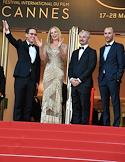70-й Каннский международный кинофестиваль 2017 / Festival de Cannes 2017. День двенадцатый. Церемония закрытия кинофестиваля прошла во Дворце фестивалей и конгрессов. Справа налево: египетский режиссер Диаб Мохамед, художник-постановщик международного кинофестиваля в Чехии Карел Ох, актриса Ума Турман и актер Реда Катеб Реда перед началом церемонии.