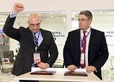 ХХI Петербургский международный экономический форум (ПМЭФ) 2017 прошел в Конгрессно-выставочном центре "Экспофорум". День первый. Генеральный директор УК "Металлоинвест" Андрей Варичев (слева) и генеральный директор Фонда развития моногородов Илья Кривогов (справа) во время церемонии подписания соглашения о сотрудничестве в реализации проектов, направленных на развитие моногородов.