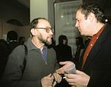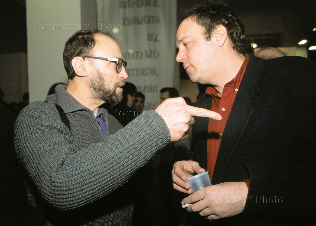 Поэт Дмитрий Пригов (слева) на выставке современной фотографии в Якут-галерее.
