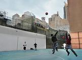 Жанровая фотография. Темнокожие дети играют в баскетбол на школьной площадке в районе Манхеттена.