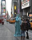 Жанровая фотография. Уличный артист (мим) в костюме "Статуи Свободы" разговаривает с прохожими на Таймс Сквер.