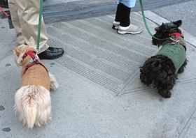 Жанровая фотография. Две собаки породы шотландский терьер на улице города.