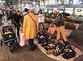 Жанровая фотография. Афроамериканец продает поддельные брендовые сумки на Бродвее в Манхэттене.