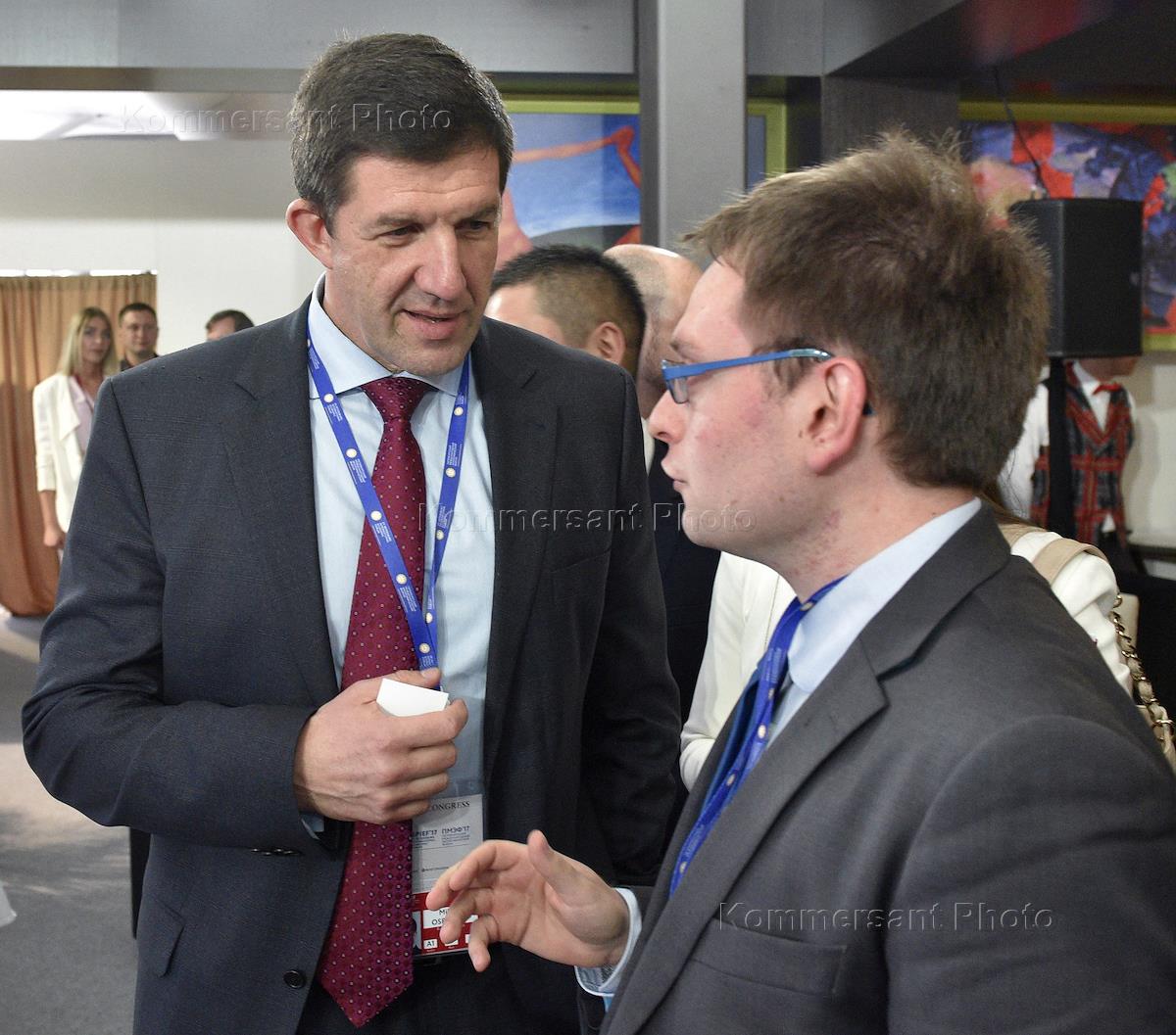 ХХI Петербургский международный экономический форум (ПМЭФ) 2017. День первый. Круглый стол ИД "Коммерсантъ" в рамках ПМЭФ-2017 "Россия на связи. Цифровая экономика страны на ландшафте 5G". Министр связи и массовых коммуникаций России Николай Никифоров (справа) и генеральный директор российской телекоммуникационной компании МегаФон Сергей Солдатенков (слева) во время круглого стола.