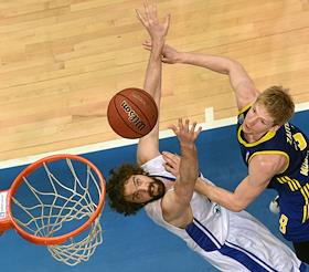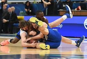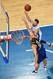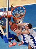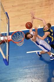 Единая лига ВТБ по баскетболу. Полуфинал. Матч между командами "Химки" (Химки) и "Зенит" (Санкт-Петербург) в Баскетбольном центре "Химки". Игрок команды "Химки" Алексей Швед (справа) и игрок команды "Зенит" Стефан Маркович (слева) во время матча.