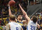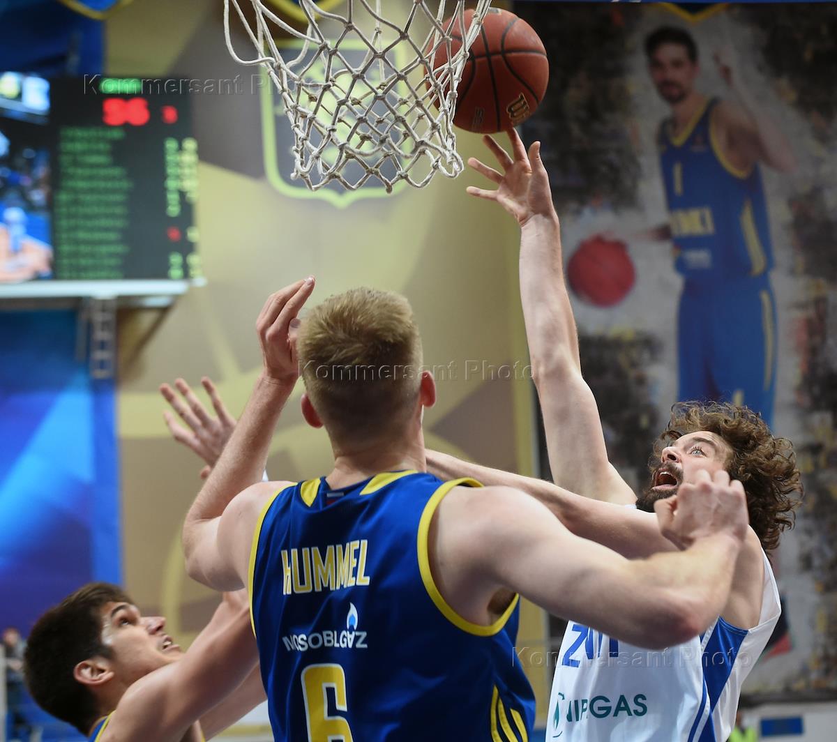 Единая лига ВТБ по баскетболу. Полуфинал. Матч между командами "Химки" (Химки) и "Зенит" (Санкт-Петербург) в Баскетбольном центре "Химки". Слева направо: игрок команды "Зенит" Янис Тимма, игрок команды "Химки" Мако Тодорович и игрок команды "Зенит" Кайл Лэндри во время матча.