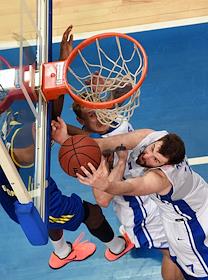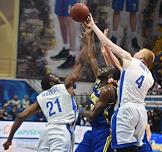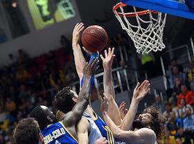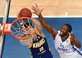 Единая лига ВТБ по баскетболу. Полуфинал. Матч между командами "Химки" (Химки) и "Зенит" (Санкт-Петербург) в Баскетбольном центре "Химки". Игровой момент матча.