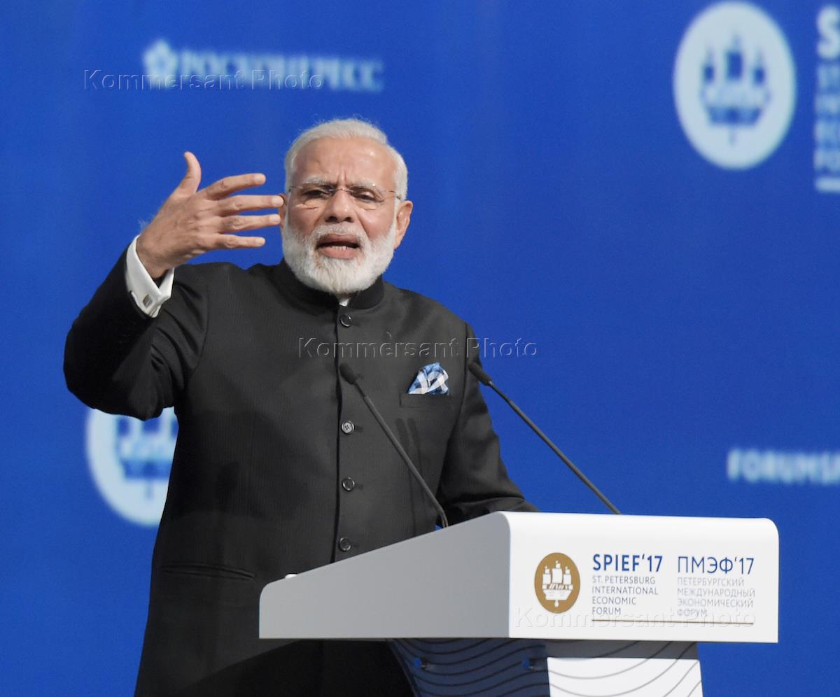 ХХI Петербургский международный экономический форум (ПМЭФ) 2017. Премьер-министр Индии Нарендра Моди (слева) и президент России Владимир Путин (справа) во время пленарного заседания.