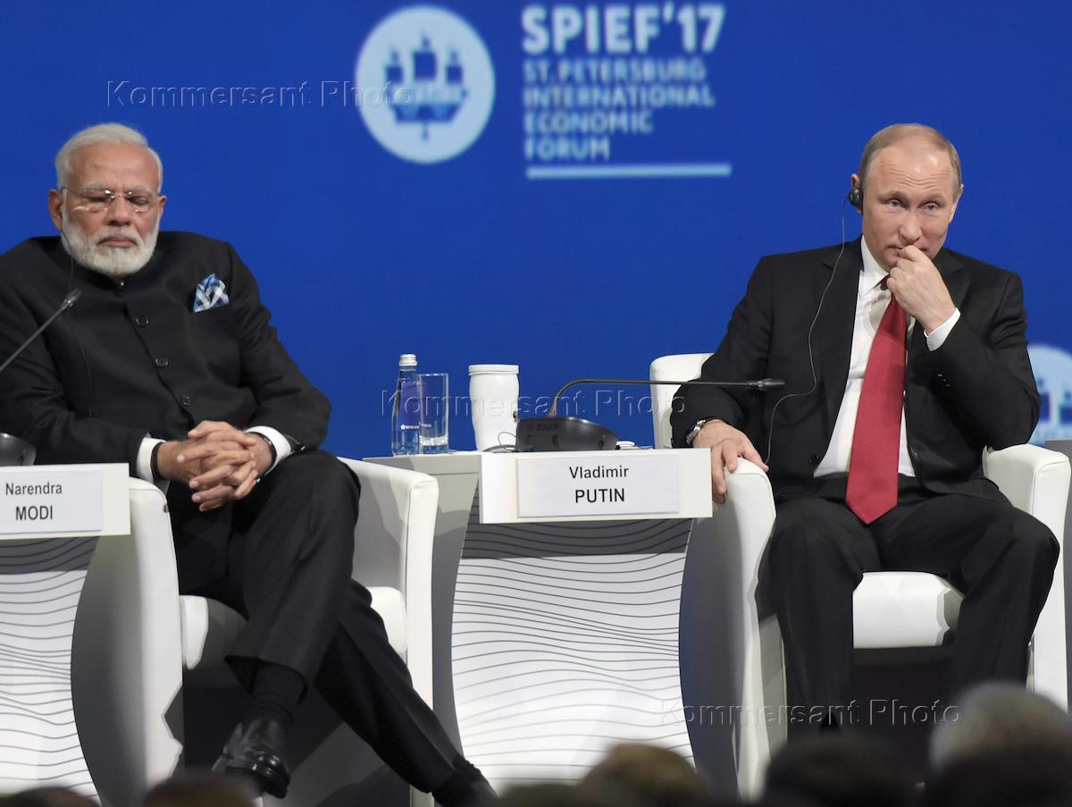 ХХI Петербургский международный экономический форум (ПМЭФ) 2017. Премьер-министр Индии Нарендра Моди (слева) и президент России Владимир Путин (справа) во время пленарного заседания.