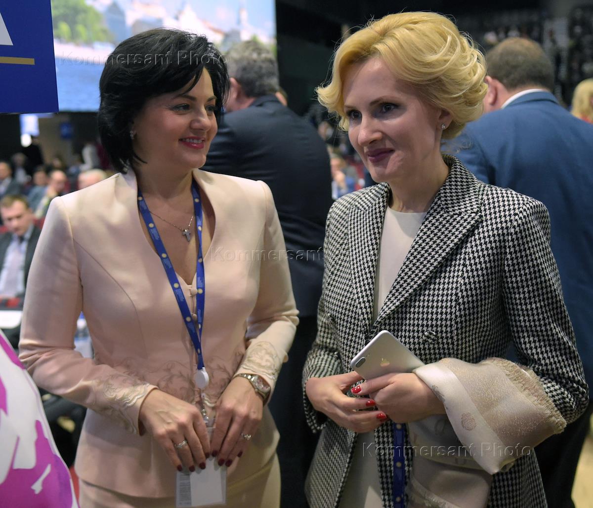 ХХI Петербургский международный экономический форум (ПМЭФ) 2017. Заместитель министра обороны России Татьяна Шевцова (слева) и заместитель председателя Государственной думы России Ирина Яровая (справа) перед началом пленарного заседания.