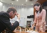 Вице-чемпион мира, действующий чемпион Европы по шахматам Александра Костенюк (слева) во время сеанса одновременной игры в шахматы. Сеанс прошел в рамках открытого шахматного матча на кубок "Судостроительного банка" в Культурном центре Главного управления дипломатического корпуса (УПДК) Министерства иностранных дел (МИД) России.