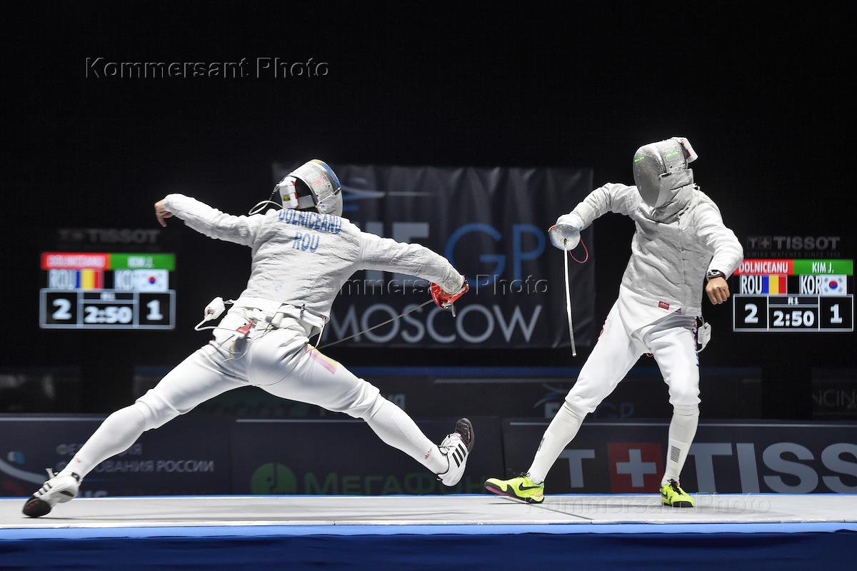 Международный турнир по фехтованию на саблях "Московская сабля 2017" прошел на малой арене ВТБ Ледового дворца. Серия Гран-при. Финал. Мужчины. Итальянский спортсмен Лука Куратоли (слева) и южнокорейский спортсмен Ким Джон Хван (справа) во время поединка.