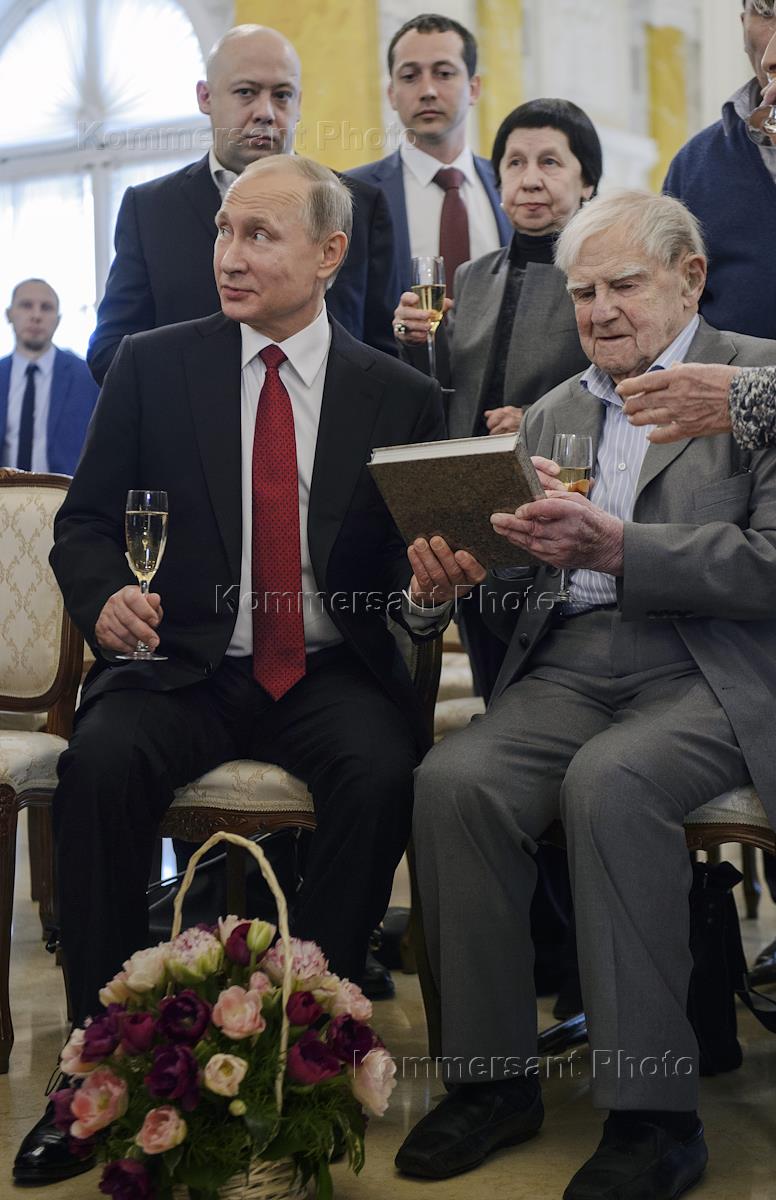 Церемония награждения писателя Даниила Гранина государственной премией прошла в Константиновском дворце в Стрельне. Писатель Даниил Гранин (слева) и президент России Владимир Путин (справа) во время церемонии.
