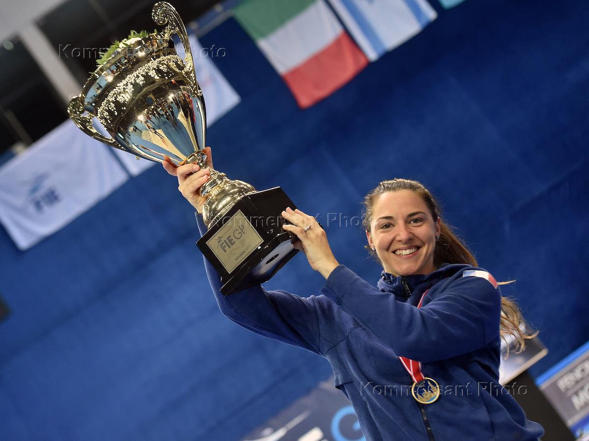 Международный турнир по фехтованию на саблях. Серия Гран-при "Московская сабля" на малой арене ВТБ Ледового дворца. Финал. Женщины. Французская фехтовальщица Шарлотта Лембах во время церемонии награждения.