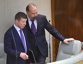Парламентские слушания на тему "Создание правовых условий для обеспечения жителей города Москвы комфортным и современным жильем как ключевой элемент реновации жилищного фонда" прошли в Государственной думе (ГД) России. Заместитель председателя ГД России Петр Толстой (слева) и председатель комитета ГД России по транспорту и строительству Евгений Москвичев (справа) во время слушаний.