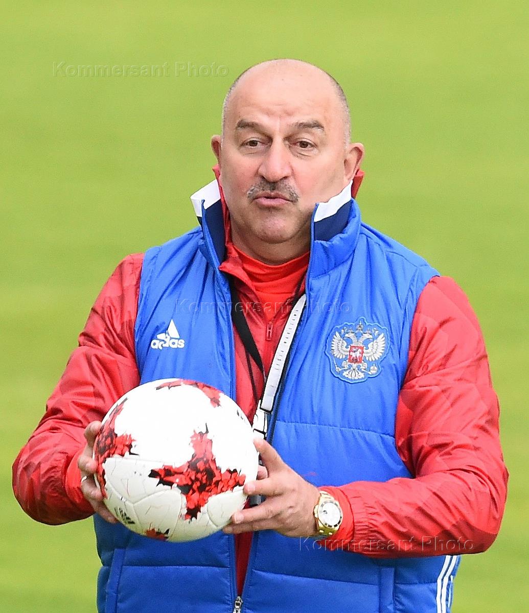 Тренировка национальной сборной России по футболу прошла на стадионе имени Э.Стрельцова. Главный тренер сборной России по футболу Станислав Черчесов во время тренировки.