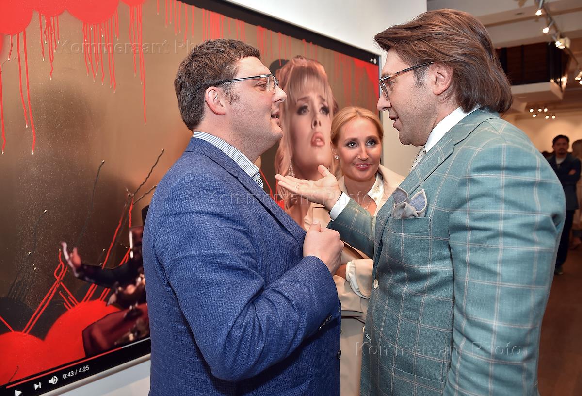 Закрытый показ проекта Сергея Шнурова "Ретроспектива Брендреализма". основатель коммуникационного агентства PR Connection Agency Полина Киценко (слева) и телеведущий Андрей Малахов (в центре) во время открытия экспозиции в Московском музее современного искусства (ММСИ).