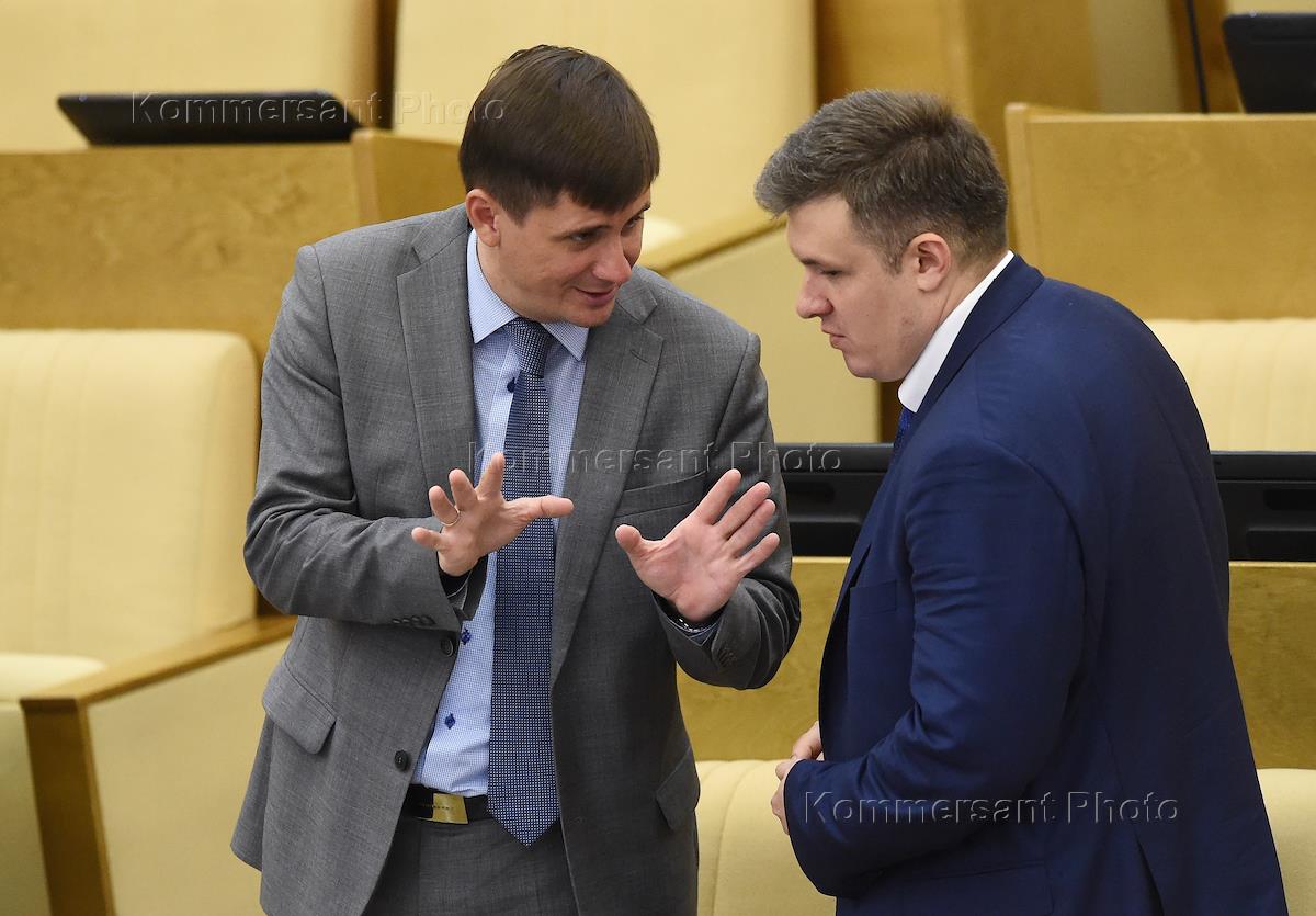 Пленарное заседание Государственной думы (ГД) России. Заместитель председателя комитета ГД России по экономической политике, промышленности, инновационному развитию и предпринимательству Денис Кравченко (слева) перед началом заседания.