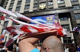 Виды Москвы. Праздничный плакат "12 июня. День России" на фасаде здания Государственной думы России.