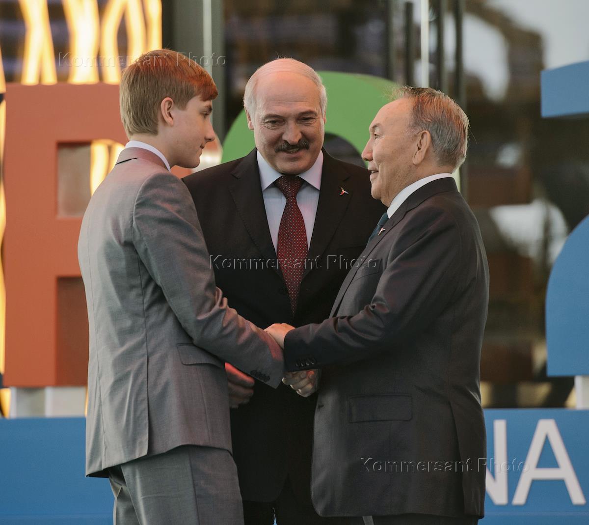 Рабочая поездка президента Росси Владимира Путина в Астану. Церемония открытия международной специализированной выставки "Астана ЭКСПО 2017". Президент Казахстана Нурсултан Назарбаев (справа) и президент Белоруссии Александр Лукашенко (в центре) с сыном Николаем (слева) перед началом церемонии.