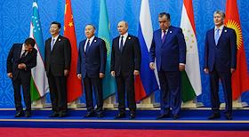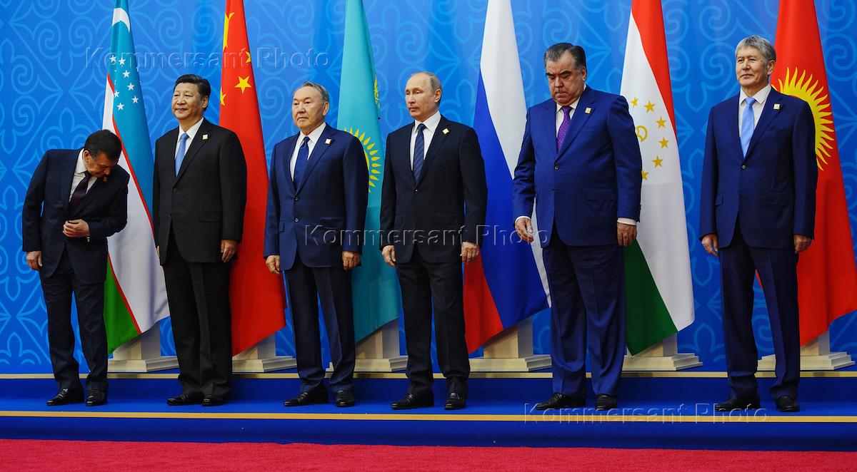 Слева направо: президент Узбекистана Шавкат Мирзиеев, председатель КНР Си Цзиньпин, президент Казахстана Нурсултан Назарбаев, президент России Владимир Путин,президент Таджикистана Эмомали Рахмон и президент Киргизии Алмазбек Атамбаев перед заседанием совета глав государств - членов Шанхайской организации сотрудничества (ШОС).