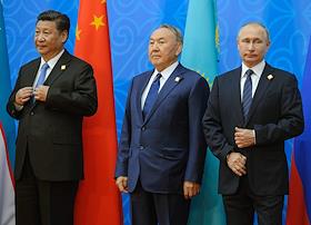 Президент России Владимир Путин (справа), президент Казахстана Нурсултан Назарбаев (в центре) и председатель КНР Си Цзиньпин (слева) перед заседанием совета глав государств - членов Шанхайской организации сотрудничества (ШОС).