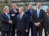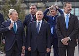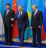 Рабочая поездка президента Росси Владимира Путина в Астану. Саммит Шанхайской организации сотрудничества (ШОС). Слева направо: президент Казахстана Нурсултан Назарбаев, президент России Владимир Путин и президент Таджикистана Эмомали Рахмон перед заседанием совета глав государств - членов Шанхайской организации сотрудничества (ШОС).