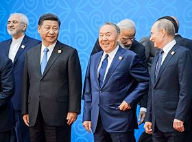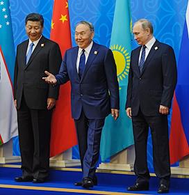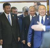 Слева направо: председатель КНР Си Цзиньпин, президент Казахстана Нурсултан Назарбаев, президент России Владимир Путин и президент Таджикистана Эмомали Рахмон перед заседанием совета глав государств - членов Шанхайской организации сотрудничества (ШОС).