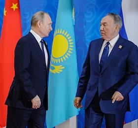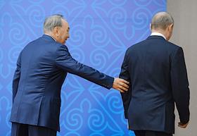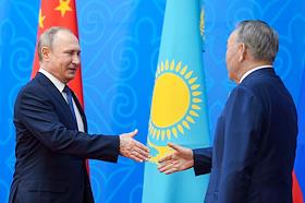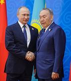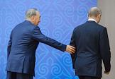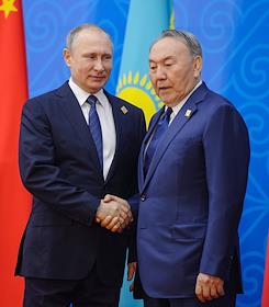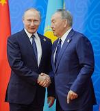 Президент России Владимир Путин (справа) и президент Казахстана Нурсултан Назарбаев (слева) перед заседанием совета глав государств - членов Шанхайской организации сотрудничества (ШОС).